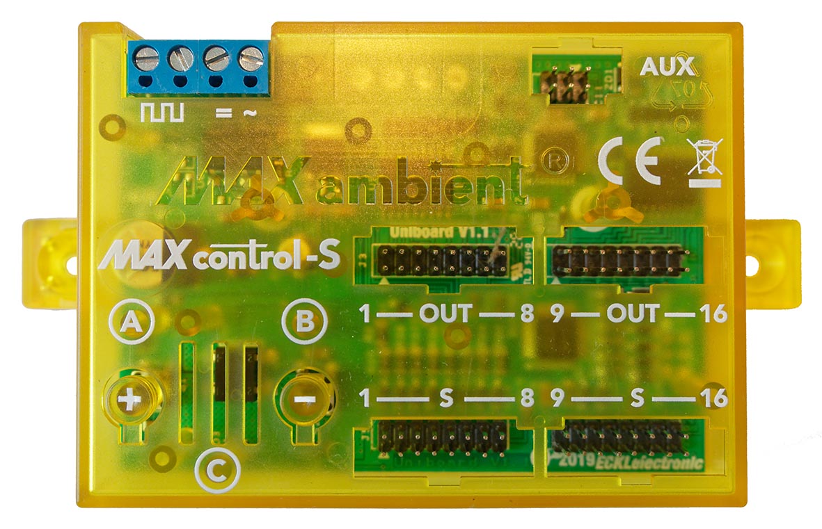 Der MAX ambient Lichtsignal-Controller bietet 16 individuell und (nahezu) stufenlos dimmbare Ausgänge mit je 62 mA. Die symmetrische Lastverteilung (Balanced-Load-Technologie) erlaubt es zudem, höhere Lasten bei entsprechend reduzierter Helligkeit zu nutzen. Dank des intelligenten Überlast-Managements werden im Fall von auftretenden Überlastungen die jeweiligen Kanäle automatisch heruntergedimmt. Zudem sorgt eine Kurzschlusserkennung für eine automatische Lastabschaltung zum Schutz der Ausgänge.